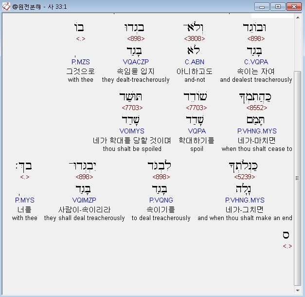 히브리어구약BHS,1 הֹוי שֹׁודֵד וְאַתָּה לֹא שָׁדוּד וּבֹוגֵד וְלֹא־בָגְדוּ בֹו כַּהֲתִמְךָ שֹׁודֵד תּוּשַּׁד כַּנְּלֹתְךָ לִבְגֹּד יִבְגְּדוּ־בָךְ׃ ס