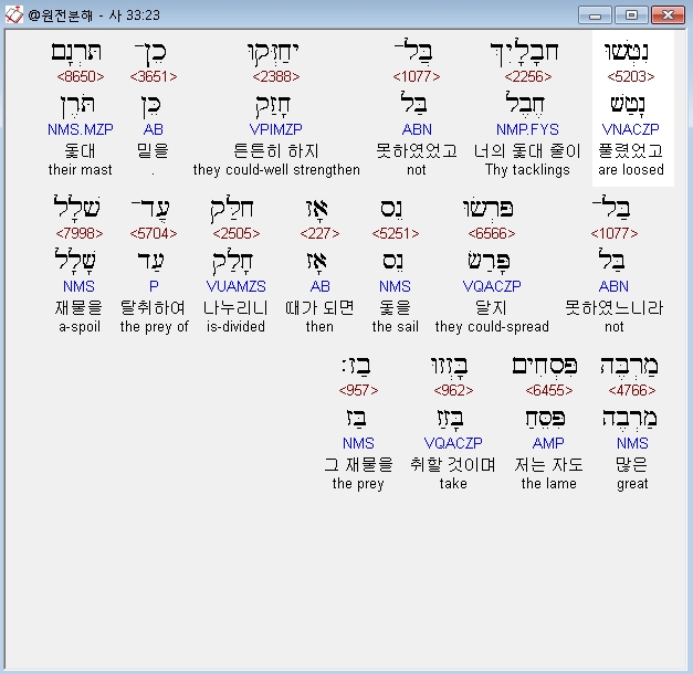 영어NASB,23 Your tackle hangs slack; It cannot hold the base of its mast firmly, Nor spread out the sail. Then the prey of an abundant spoil will be divided; The lame will take the plunder.