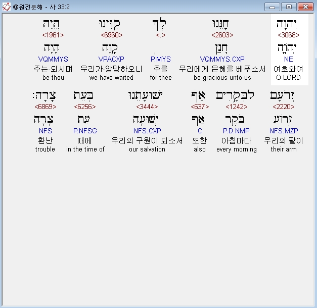 히브리어구약BHS,2 יְהוָה חָנֵּנוּ לְךָ קִוִּינוּ הֱיֵה זְרֹעָם לַבְּקָרִים אַף־יְשׁוּעָתֵנוּ בְּעֵת צָרָה׃