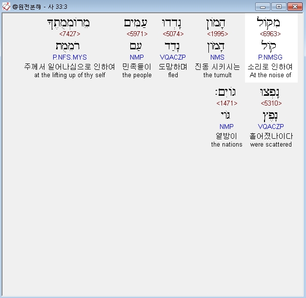 히브리어구약BHS,3 מִקֹּול הָמֹון נָדְדוּ עַמִּים מֵרֹומְמֻתֶךָ נָפְצוּ גֹּויִם׃