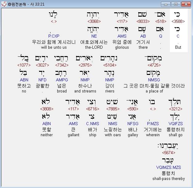 히브리어구약BHS,21 כִּי אִם־שָׁם אַדִּיר יְהוָה לָנוּ מְקֹום־נְהָרִים יְאֹרִים רַחֲבֵי יָדָיִם בַּל־תֵּלֶךְ בֹּו אֳנִי־שַׁיִט וְצִי אַדִּיר לֹא יַעַבְרֶנּוּ׃