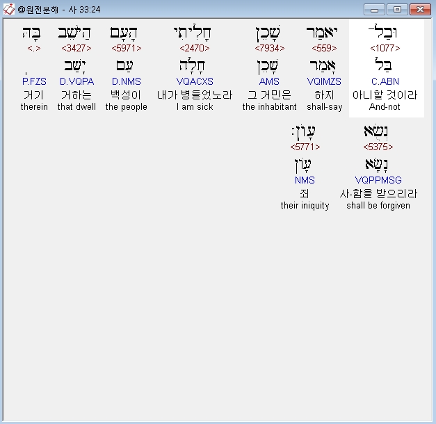 히브리어구약BHS,24 וּבַל־יֹאמַר שָׁכֵן חָלִיתִי הָעָם הַיֹּשֵׁב בָּהּ נְשֻׂא עָוֹן׃