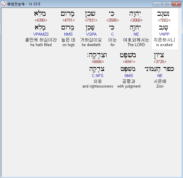 히브리어구약BHS,5 נִשְׂגָּב יְהוָה כִּי שֹׁכֵן מָרֹום מִלֵּא צִיֹּון מִשְׁפָּט וּצְדָקָה׃