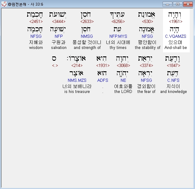 히브리어구약BHS,6 וְהָיָה אֱמוּנַת עִתֶּיךָ חֹסֶן יְשׁוּעֹת חָכְמַת וָדָעַת יִרְאַת יְהוָה הִיא אֹוצָרֹו׃ ס
