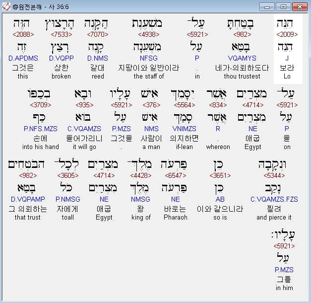 히브리어구약BHS,6 הִנֵּה בָטַחְתָּ עַל־מִשְׁעֶנֶת הַקָּנֶה הָרָצוּץ הַזֶּה עַל־מִצְרַיִם אֲשֶׁר יִסָּמֵךְ אִישׁ עָלָיו וּבָא בְכַפֹּו וּנְקָבָהּ כֵּן פַּרְעֹה מֶלֶךְ־מִצְרַיִם לְכָל־הַבֹּטְחִים עָלָיו׃