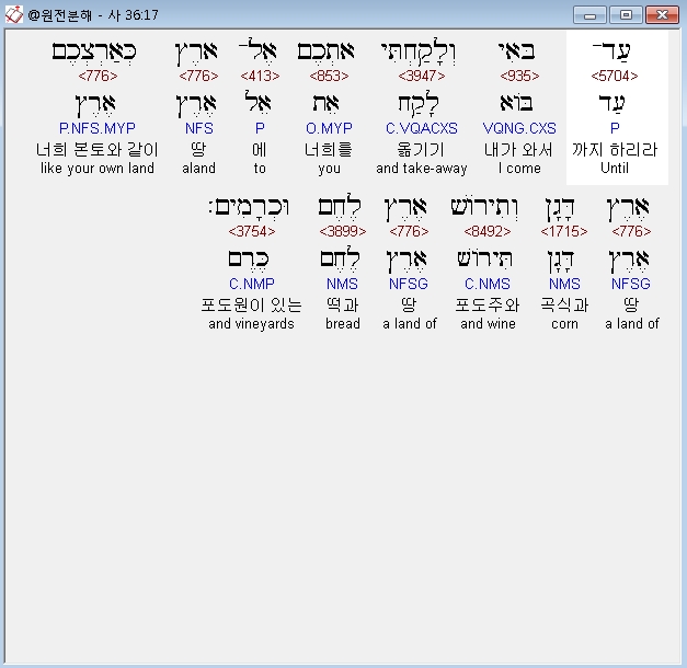 히브리어구약BHS,17 עַד־בֹּאִי וְלָקַחְתִּי אֶתְכֶם אֶל־אֶרֶץ כְּאַרְצְכֶם אֶרֶץ דָּגָן וְתִירֹושׁ אֶרֶץ לֶחֶם וּכְרָמִים׃