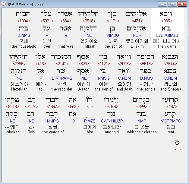 영어NASB,22 Then Eliakim the son of Hilkiah, who was over the household, and Shebna the scribe and Joah the son of Asaph, the recorder, came to Hezekiah with their clothes torn and told him the words of Rabshakeh.