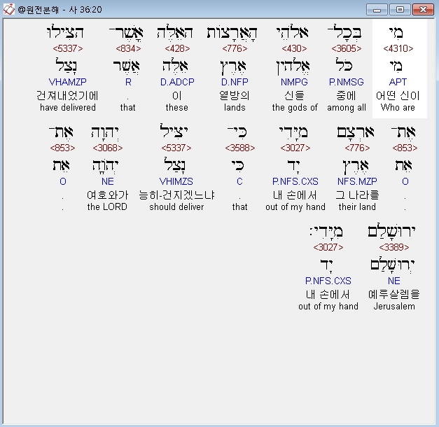 히브리어구약BHS,20 מִי בְּכָל־אֱלֹהֵי הָאֲרָצֹות הָאֵלֶּה אֲשֶׁר־הִצִּילוּ אֶת־אַרְצָם מִיָּדִי כִּי־יַצִּיל יְהוָה אֶת־יְרוּשָׁלִַם מִיָּדִי׃