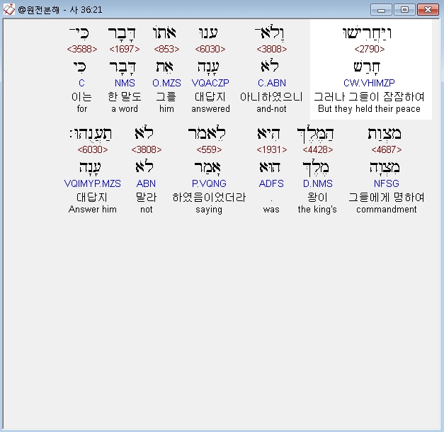 히브리어구약BHS,21 וַיַּחֲרִישׁוּ וְלֹא־עָנוּ אֹתֹו דָּבָר כִּי־מִצְוַת הַמֶּלֶךְ הִיא לֵאמֹר לֹא תַעֲנֻהוּ׃