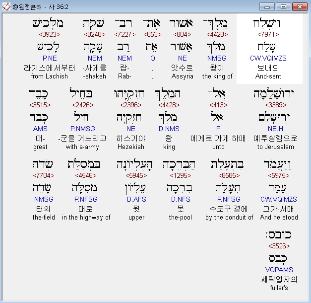 히브리어구약BHS,2 וַיִּשְׁלַח מֶלֶךְ־אַשּׁוּר אֶת־רַב־שָׁקֵה מִלָּכִישׁ יְרוּשָׁלְַמָה אֶל־הַמֶּלֶךְ חִזְקִיָּהוּ בְּחֵיל כָּבֵד וַיַּעֲמֹד בִּתְעָלַת הַבְּרֵכָה הָעֶלְיֹונָה בִּמְסִלַּת שְׂדֵה כֹובֵס׃