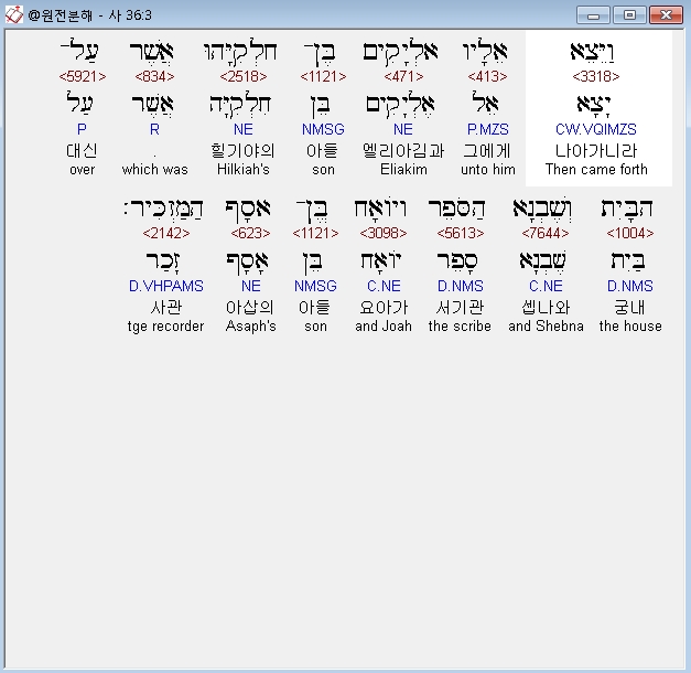 히브리어구약BHS,3 וַיֵּצֵא אֵלָיו אֶלְיָקִים בֶּן־חִלְקִיָּהוּ אֲשֶׁר עַל־הַבָּיִת וְשֶׁבְנָא הַסֹּפֵר וְיֹואָח בֶּן־אָסָף הַמַּזְכִּיר׃