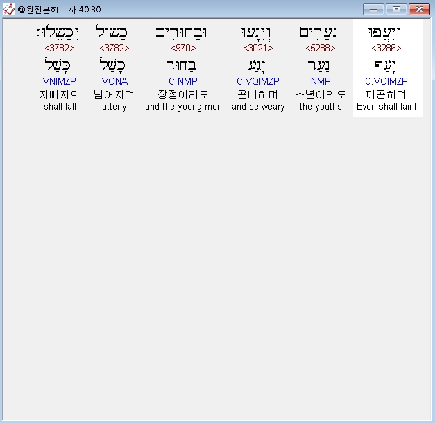 히브리어구약BHS,30 וְיִעֲפוּ נְעָרִים וְיִגָעוּ וּבַחוּרִים כָּשֹׁול יִכָּשֵׁלוּ׃