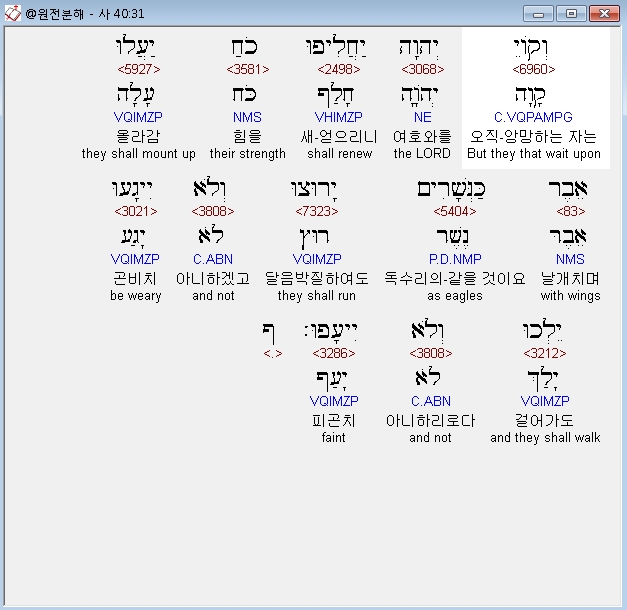 헬라어구약Septuagint,31 οι δε υπομενοντες τον θεον αλλαξουσιν ισχυν πτεροφυησουσιν ως αετοι δραμουνται και ου κοπιασουσιν βαδιουνται και ου πεινασουσιν