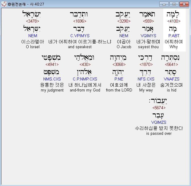 히브리어구약BHS,27 לָמָּה תֹאמַר יַעֲקֹב וּתְדַבֵּר יִשְׂרָאֵל נִסְתְּרָה דַרְכִּי מֵיְהוָה וּמֵאֱלֹהַי מִשְׁפָּטִי יַעֲבֹור׃