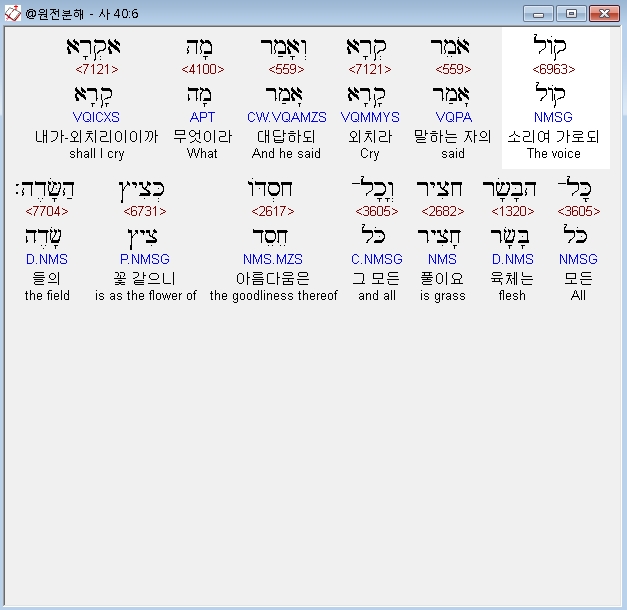 히브리어구약BHS,6 קֹול אֹמֵר קְרָא וְאָמַר מָה אֶקְרָא כָּל־הַבָּשָׂר חָצִיר וְכָל־חַסְדֹּו כְּצִיץ הַשָּׂדֶה׃