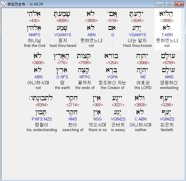 히브리어구약BHS,28 הֲלֹוא יָדַעְתָּ אִם־לֹא שָׁמַעְתָּ אֱלֹהֵי עֹולָם יְהוָה בֹּורֵא קְצֹות הָאָרֶץ לֹא יִיעַף וְלֹא יִיגָע אֵין חֵקֶר לִתְבוּנָתֹו׃
