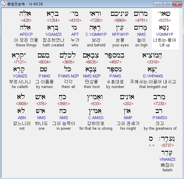 히브리어구약BHS,26 שְׂאוּ־מָרֹום עֵינֵיכֶם וּרְאוּ מִי־בָרָא אֵלֶּה הַמֹּוצִיא בְמִסְפָּר צְבָאָם לְכֻלָּם בְּשֵׁם יִקְרָא מֵרֹב אֹונִים וְאַמִּיץ כֹּחַ אִישׁ לֹא נֶעְדָּר׃ ס