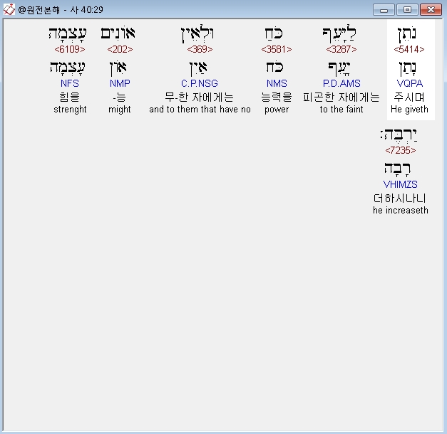 히브리어구약BHS,29 נֹתֵן לַיָּעֵף כֹּחַ וּלְאֵין אֹונִים עָצְמָה יַרְבֶּה׃