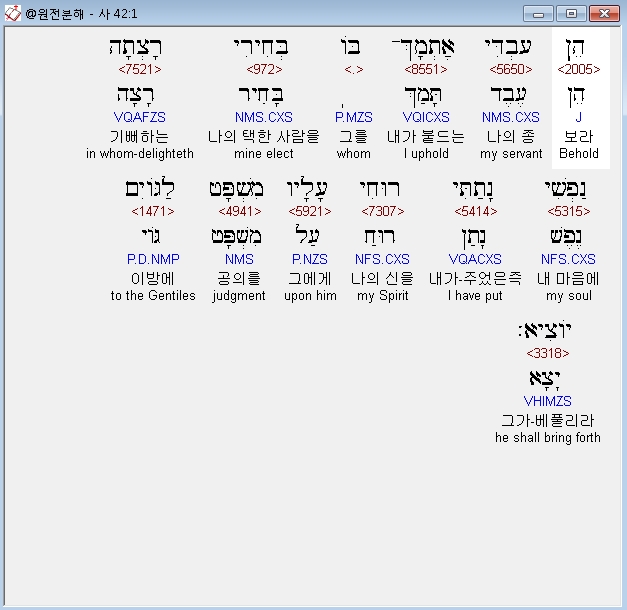 히브리어구약BHS,1 הֵן עַבְדִּי אֶתְמָךְ־בֹּו בְּחִירִי רָצְתָה נַפְשִׁי נָתַתִּי רוּחִי עָלָיו מִשְׁפָּט לַגֹּויִם יֹוצִיא׃