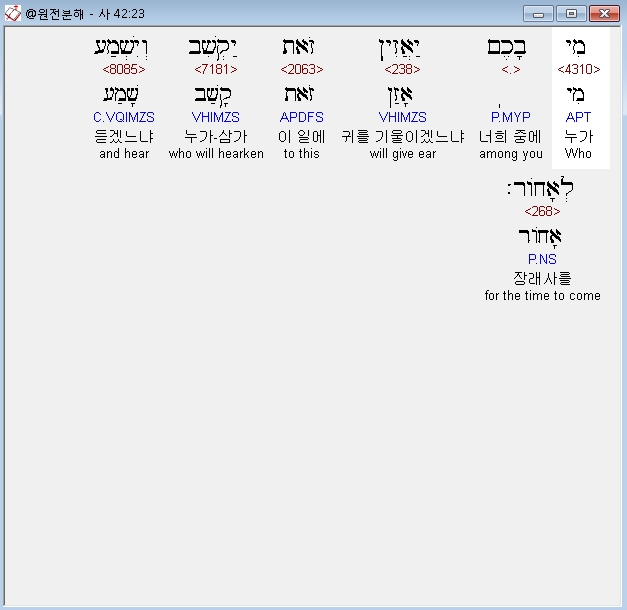 히브리어구약BHS,23 מִי בָכֶם יַאֲזִין זֹאת יַקְשִׁב וְיִשְׁמַע לְאָחֹור׃