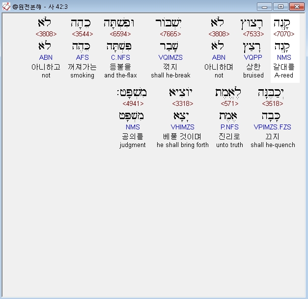 히브리어구약BHS,3 קָנֶה רָצוּץ לֹא יִשְׁבֹּור וּפִשְׁתָּה כֵהָה לֹא יְכַבֶּנָּה לֶאֱמֶת יֹוצִיא מִשְׁפָּט׃