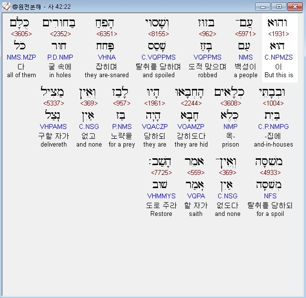 히브리어구약BHS,22 וְהוּא עַם־בָּזוּז וְשָׁסוּי הָפֵחַ בַּחוּרִים כֻּלָּם וּבְבָתֵּי כְלָאִים הָחְבָּאוּ הָיוּ לָבַז וְאֵין מַצִּיל מְשִׁסָּה וְאֵין־אֹמֵר הָשַׁב׃