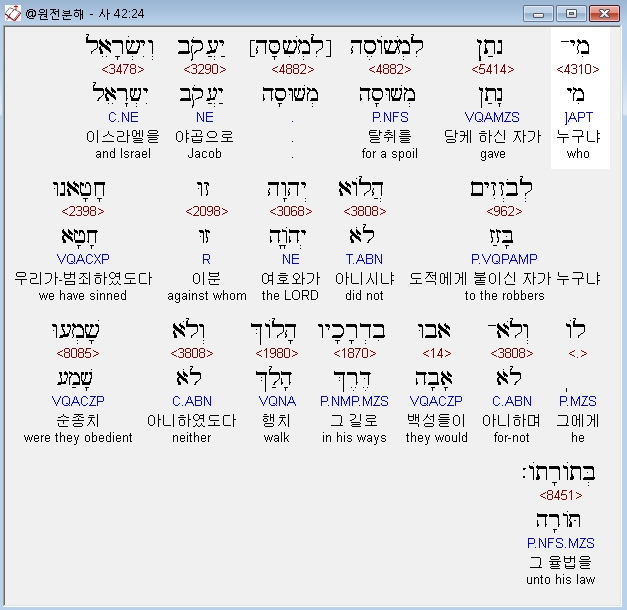 헬라어구약Septuagint,24 τις εδωκεν εις διαρπαγην ιακωβ και ισραηλ τοις προνομευουσιν αυτον ουχι ο θεος ω ημαρτοσαν αυτω και ουκ εβουλοντο εν ταις οδοις αυτου πορευεσθαι ουδε ακουειν του νομου αυτου