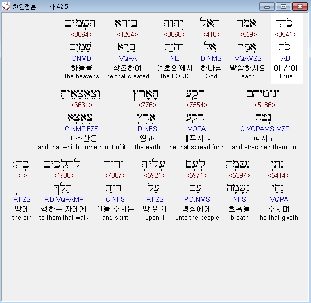 히브리어구약BHS,5 כֹּה־אָמַר הָאֵל יְהוָה בֹּורֵא הַשָּׁמַיִם וְנֹוטֵיהֶם רֹקַע הָאָרֶץ וְצֶאֱצָאֶיהָ נֹתֵן נְשָׁמָה לָעָם עָלֶיהָ וְרוּחַ לַהֹלְכִים בָּהּ׃