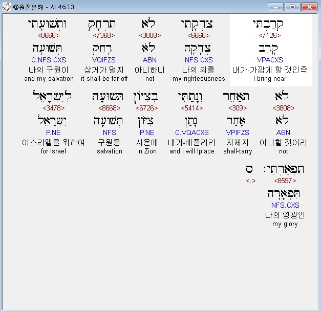 히브리어구약BHS,13 קֵרַבְתִּי צִדְקָתִי לֹא תִרְחָק וּתְשׁוּעָתִי לֹא תְאַחֵר וְנָתַתִּי בְצִיֹּון תְּשׁוּעָה לְיִשְׂרָאֵל תִּפְאַרְתִּי׃ ס
