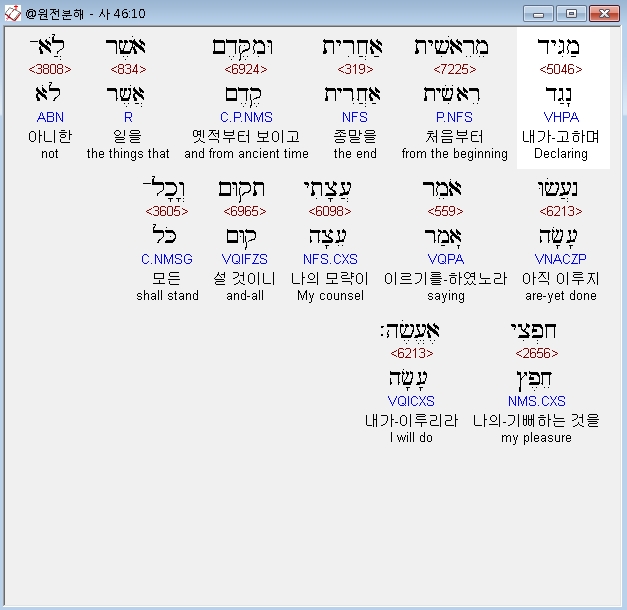헬라어구약Septuagint,10 αναγγελλων προτερον τα εσχατα πριν αυτα γενεσθαι και αμα συνετελεσθη και ειπα πασα μου η βουλη στησεται και παντα οσα βεβουλευμαι ποιησω