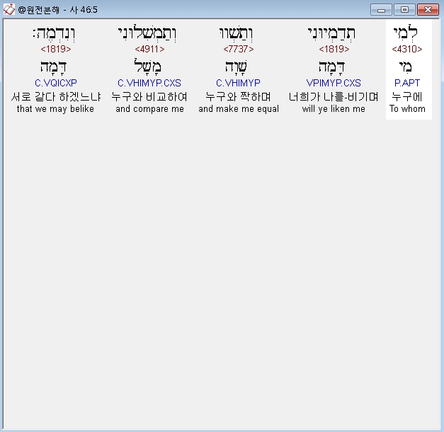 히브리어구약BHS,5 לְמִי תְדַמְיוּנִי וְתַשְׁווּ וְתַמְשִׁלוּנִי וְנִדְמֶה׃