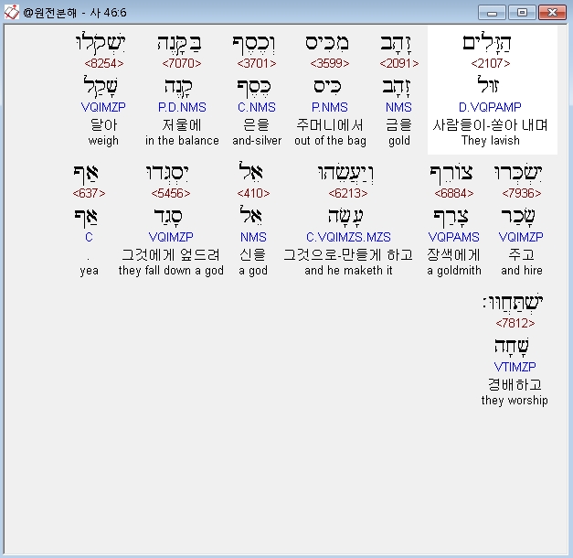 히브리어구약BHS,6 הַזָּלִים זָהָב מִכִּיס וְכֶסֶף בַּקָּנֶה יִשְׁקֹלוּ יִשְׂכְּרוּ צֹורֵף וְיַעֲשֵׂהוּ אֵל יִסְגְּדוּ אַף־יִשְׁתַּחֲוּוּ׃