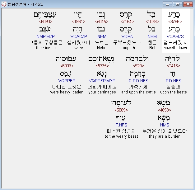 히브리어구약BHS,1 כָּרַע בֵּל קֹרֵס נְבֹו הָיוּ עֲצַבֵּיהֶם לַחַיָּה וְלַבְּהֵמָה נְשֻׂאֹתֵיכֶם עֲמוּסֹות מַשָּׂא לַעֲיֵפָה׃