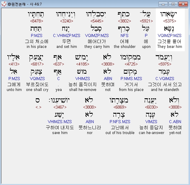영어NASB,7 "They lift it upon the shoulder and carry it; They set it in its place and it stands there. It does not move from its place. Though one may cry to it, it cannot answer; It cannot deliver him from his distress.