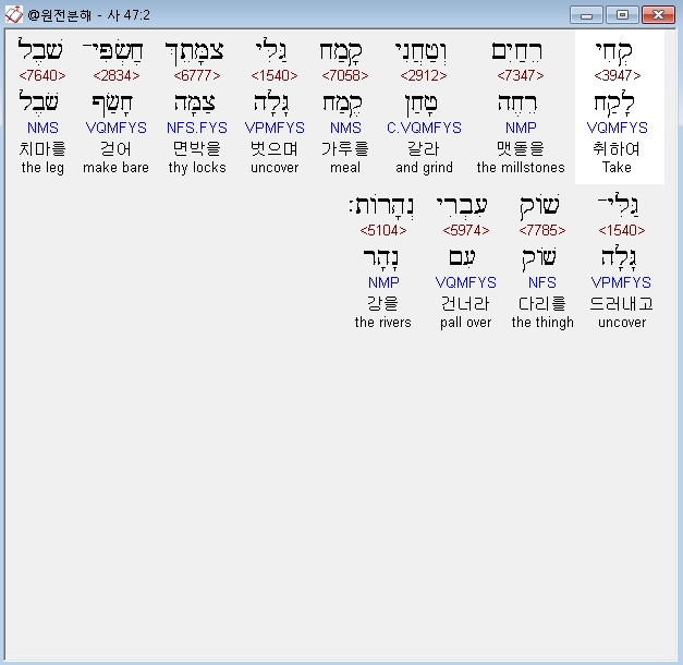 헬라어구약Septuagint,2 λαβε μυλον αλεσον αλευρον αποκαλυψαι το κατακαλυμμα σου ανακαλυψαι τας πολιας ανασυραι τας κνημας διαβηθι ποταμους