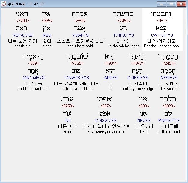 히브리어구약BHS,10 וַתִּבְטְחִי בְרָעָתֵךְ אָמַרְתְּ אֵין רֹאָנִי חָכְמָתֵךְ וְדַעְתֵּךְ הִיא שֹׁובְבָתֶךְ וַתֹּאמְרִי בְלִבֵּךְ אֲנִי וְאַפְסִי עֹוד׃