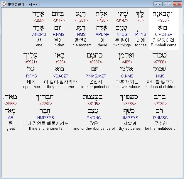 히브리어구약BHS,9 וְתָבֹאנָה לָּךְ שְׁתֵּי־אֵלֶּה רֶגַע בְּיֹום אֶחָד שְׁכֹול וְאַלְמֹן כְּתֻםָּם בָּאוּ עָלַיִךְ בְּרֹב כְּשָׁפַיִךְ בְּעָצְמַת חֲבָרַיִךְ מְאֹד׃