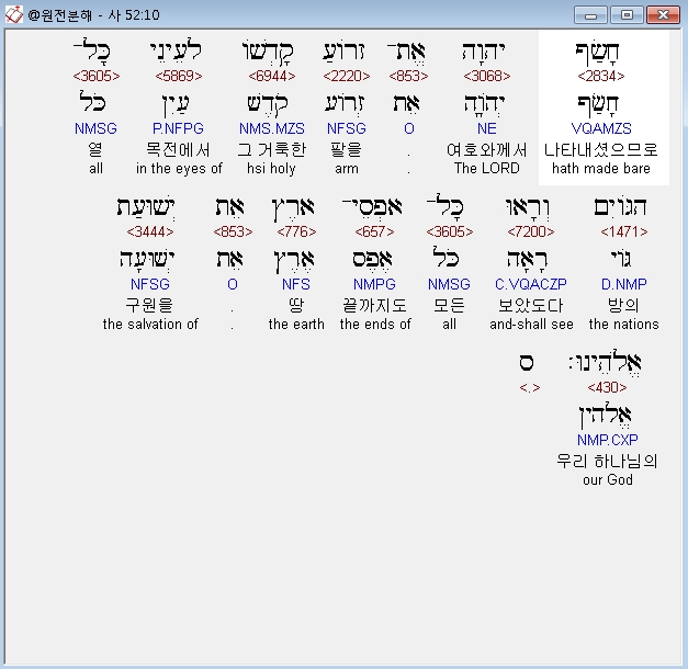 히브리어구약BHS,10 חָשַׂף יְהוָה אֶת־זְרֹועַ קָדְשֹׁו לְעֵינֵי כָּל־הַגֹּויִם וְרָאוּ כָּל־אַפְסֵי־אָרֶץ אֵת יְשׁוּעַת אֱלֹהֵינוּ׃ ס