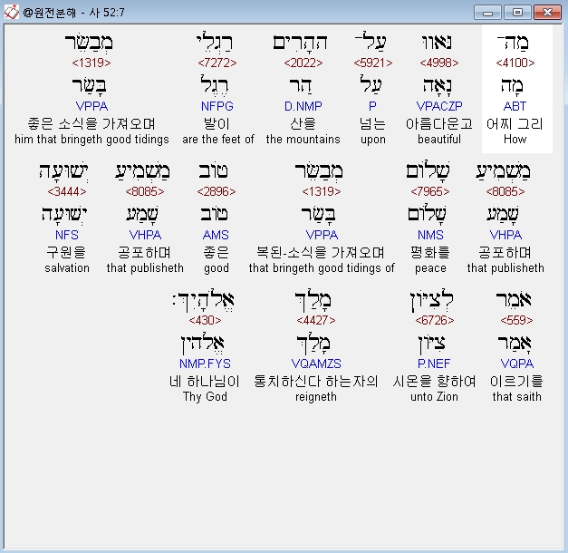 헬라어구약Septuagint,7 ως ωρα επι των ορεων ως ποδες ευαγγελιζομενου ακοην ειρηνης ως ευαγγελιζομενος αγαθα οτι ακουστην ποιησω την σωτηριαν σου λεγων σιων βασιλευσει σου ο θεος
