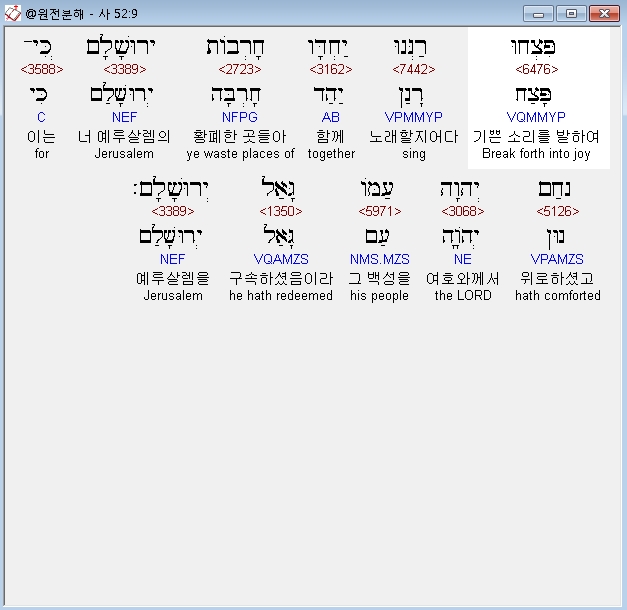 히브리어구약BHS,9 פִּצְחוּ רַנְּנוּ יַחְדָּו חָרְבֹות יְרוּשָׁלִָם כִּי־נִחַם יְהוָה עַמֹּו גָּאַל יְרוּשָׁלִָם׃