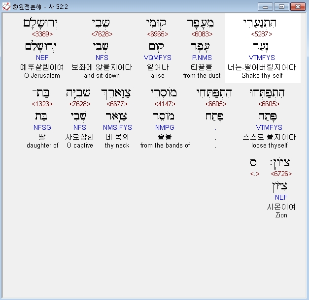히브리어구약BHS,2 הִתְנַעֲרִי מֵעָפָר קוּמִי שְּׁבִי יְרוּשָׁלִָם [כ= הִתְפַּתְּחוּ] [ק= הִתְפַּתְּחִי] מֹוסְרֵי צַוָּארֵךְ שְׁבִיָּה בַּת־צִיֹּון׃ ס