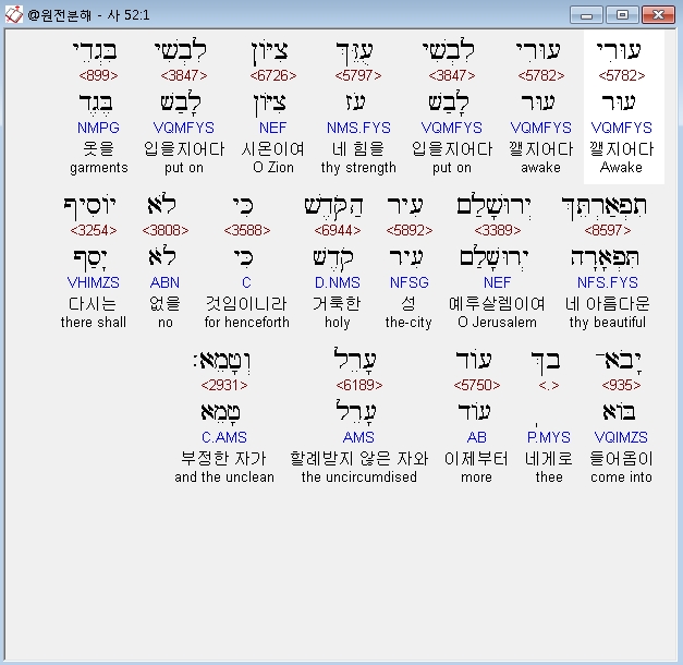 히브리어구약BHS,1 עוּרִי עוּרִי לִבְשִׁי עֻזֵּךְ צִיֹּון לִבְשִׁי בִּגְדֵי תִפְאַרְתֵּךְ יְרוּשָׁלִַם עִיר הַקֹּדֶשׁ כִּי לֹא יֹוסִיף יָבֹא־בָךְ עֹוד עָרֵל וְטָמֵא׃