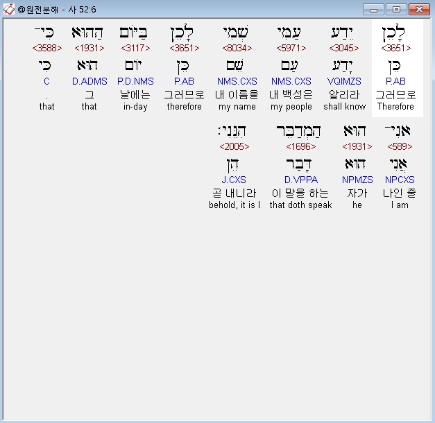 히브리어구약BHS,6 לָכֵן יֵדַע עַמִּי שְׁמִי לָכֵן בַּיֹּום הַהוּא כִּי־אֲנִי־הוּא הַמְדַבֵּר הִנֵּנִי׃
