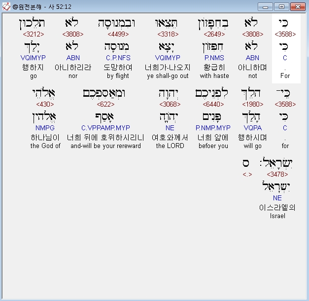 히브리어구약BHS,12 כִּי לֹא בְחִפָּזֹון תֵּצֵאוּ וּבִמְנוּסָה לֹא תֵלֵכוּן כִּי־הֹלֵךְ לִפְנֵיכֶם יְהוָה וּמְאַסִּפְכֶם אֱלֹהֵי יִשְׂרָאֵל׃ ס