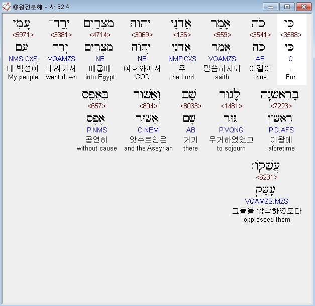 히브리어구약BHS,4 כִּי כֹה אָמַר אֲדֹנָי יְהוִה מִצְרַיִם יָרַד־עַמִּי בָרִאשֹׁנָה לָגוּר שָׁם וְאַשּׁוּר בְּאֶפֶס עֲשָׁקֹו׃