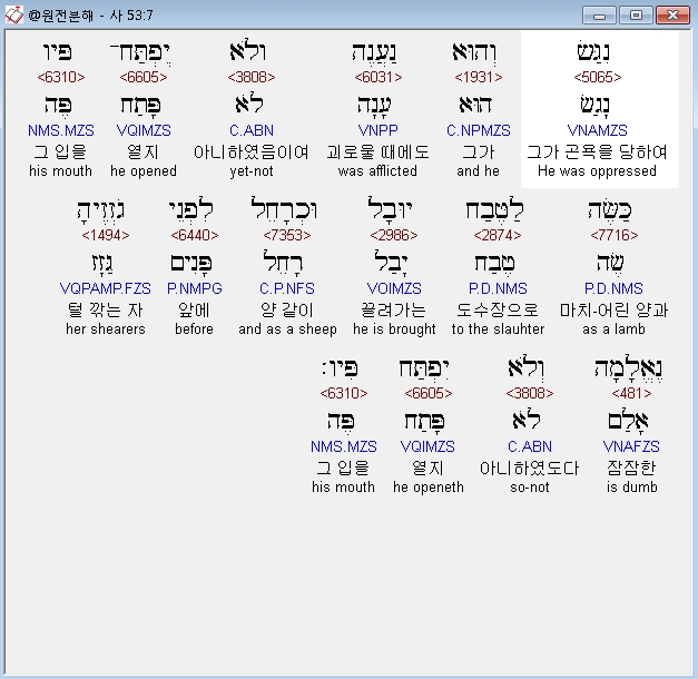 히브리어구약BHS,7 נִגַּשׂ וְהוּא נַעֲנֶה וְלֹא יִפְתַּח־פִּיו כַּשֶּׂה לַטֶּבַח יוּבָל וּכְרָחֵל לִפְנֵי גֹזְזֶיהָ נֶאֱלָמָה וְלֹא יִפְתַּח פִּיו׃