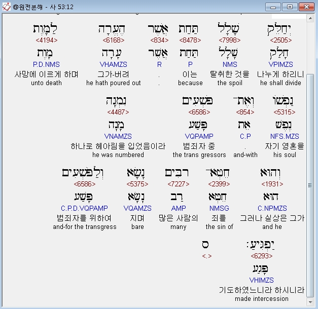 히브리어구약BHS,12 לָכֵן אֲחַלֶּק־לֹו בָרַבִּים וְאֶת־עֲצוּמִים יְחַלֵּק שָׁלָל תַּחַת אֲשֶׁר הֶעֱרָה לַמָּוֶת נַפְשֹׁו וְאֶת־פֹּשְׁעִים נִמְנָה וְהוּא חֵטְא־רַבִּים נָשָׂא וְלַפֹּשְׁעִים יַפְגִּיעַ׃ ס