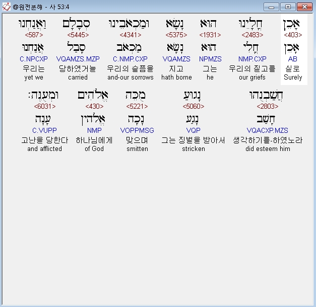 히브리어구약BHS,4 אָכֵן חֳלָיֵנוּ הוּא נָשָׂא וּמַכְאֹבֵינוּ סְבָלָם וַאֲנַחְנוּ חֲשַׁבְנֻהוּ נָגוּעַ מֻכֵּה אֱלֹהִים וּמְעֻנֶּה׃