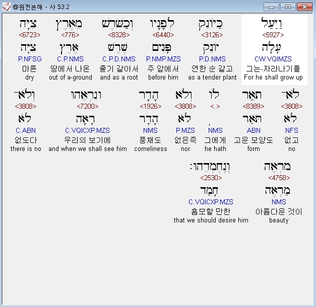 히브리어구약BHS,2 וַיַּעַל כַּיֹּונֵק לְפָנָיו וְכַשֹּׁרֶשׁ מֵאֶרֶץ צִיָּה לֹא־תֹאַר לֹו וְלֹא הָדָר וְנִרְאֵהוּ וְלֹא־מַרְאֶה וְנֶחְמְדֵהוּ׃