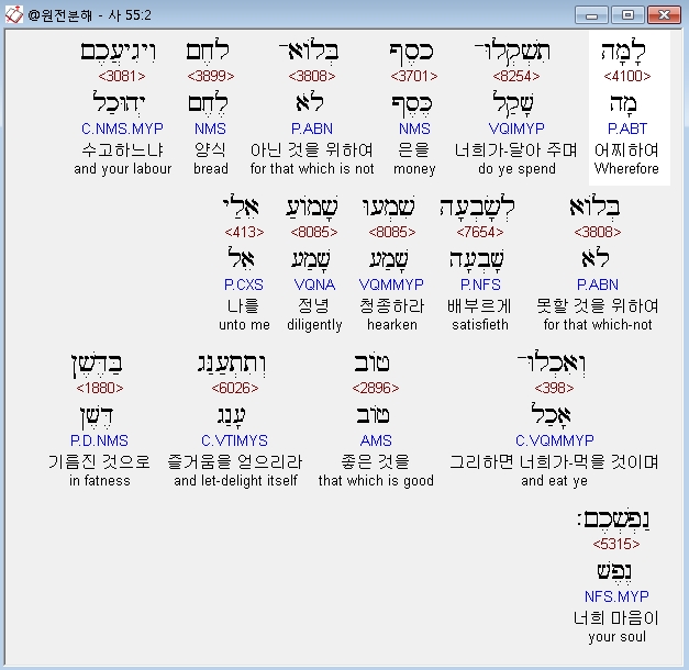 히브리어구약BHS,2 לָמָּה תִשְׁקְלוּ־כֶסֶף בְּלֹוא־לֶחֶם וִיגִיעֲכֶם בְּלֹוא לְשָׂבְעָה שִׁמְעוּ שָׁמֹועַ אֵלַי וְאִכְלוּ־טֹוב וְתִתְעַנַּג בַּדֶּשֶׁן נַפְשְׁכֶם׃